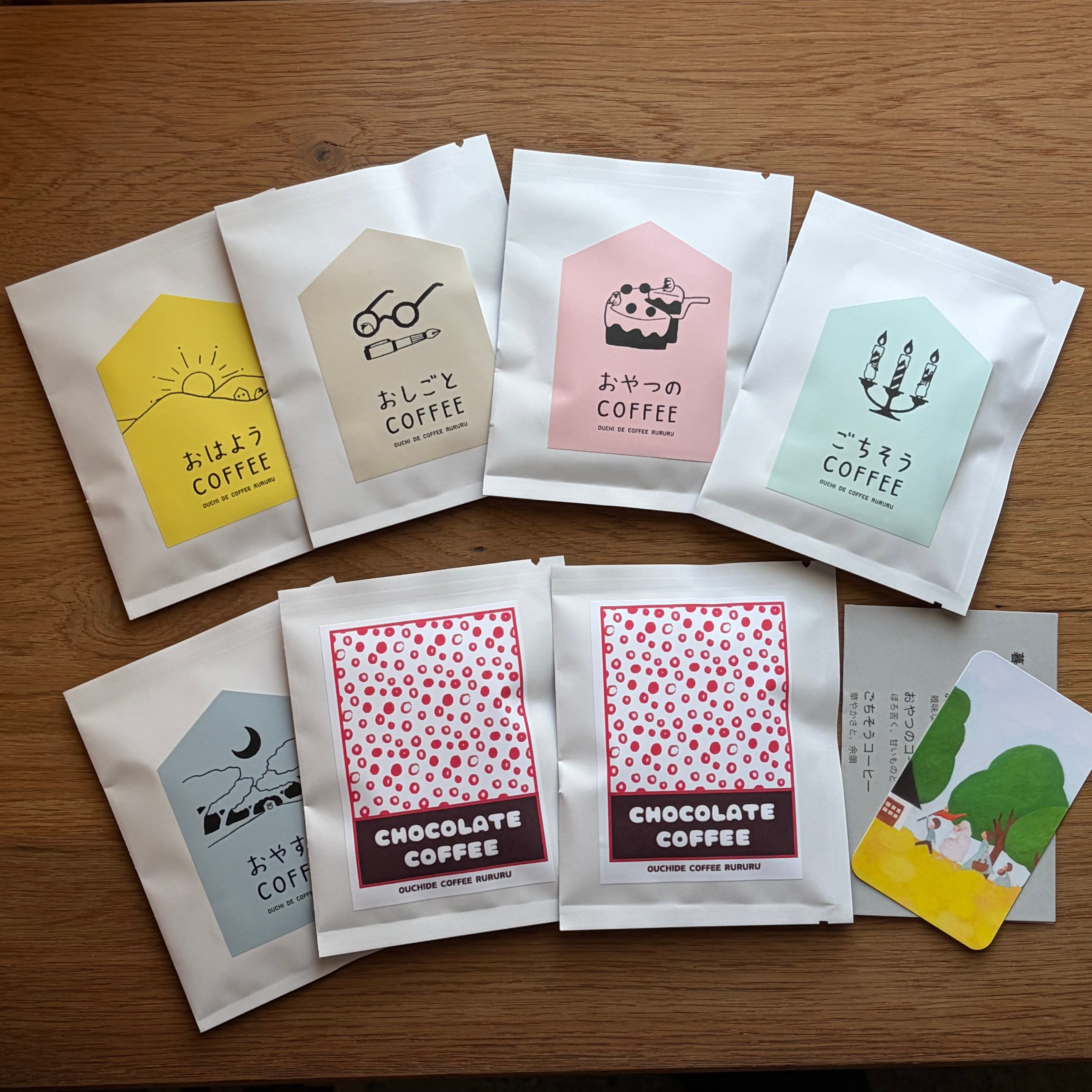 上記3種 + 華やかな香りの「ごちそうコーヒー」、夜にやさしい「おやすみコーヒー(デカフェ)」「季節のコーヒー」など、るるるのラインナップから厳選した7個を詰め合わせます。